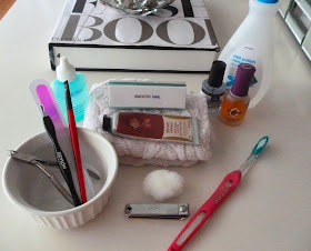 Cuticle Trimmer//Cuticle Pusher//Glass Nail File//Eyeliner Brush//Nail Clippers//Toothbrush//Cotton Balls//Rose Hand Cream//Small Hand Towel//Nail Buffer//Cuticle Remover Gel//Orly Bonder Base Coat//Out The Door Topcoat//Nail Polish Remover//Spray Bottle (not pictured)//